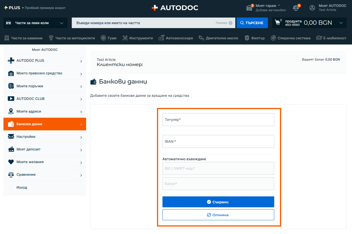 Попълнете задължителните полета: Титуляр на сметката и IBAN.