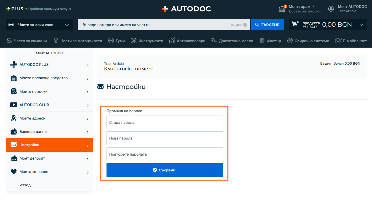 - Отиди на таба Настройки. Въведи старата си парола и създай нова. Запази промените.