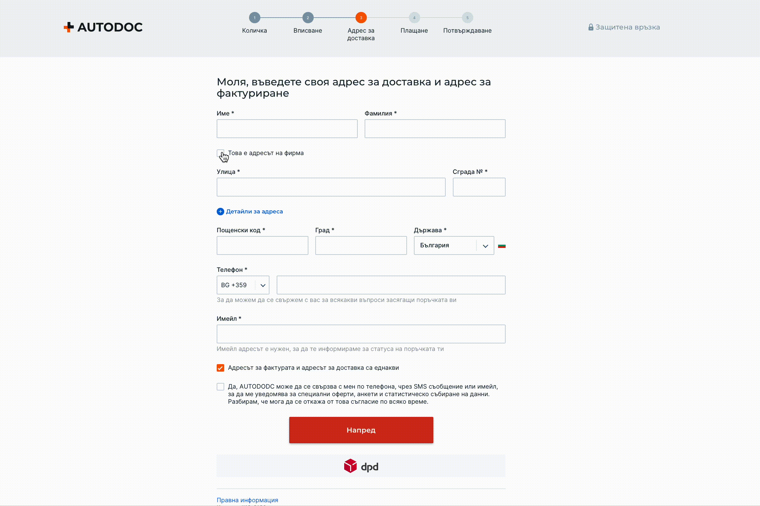 Ако е нужно адресът за фактуриране и адресът за доставка да бъдат различни, не трябва да има отметка в чекбокса „Адресът за фактурата и адресът за доставка са еднакви“.