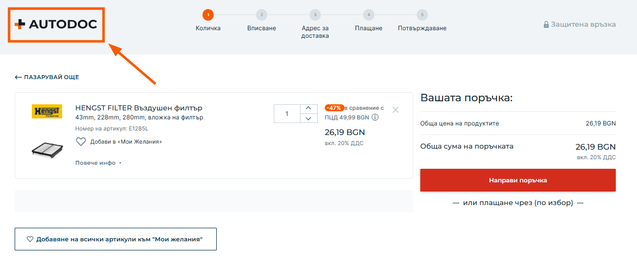 - кликни на логото на AUTODOC, за да продължиш да пазaруваш