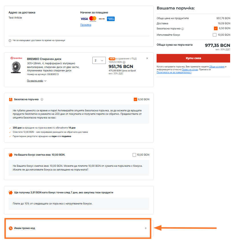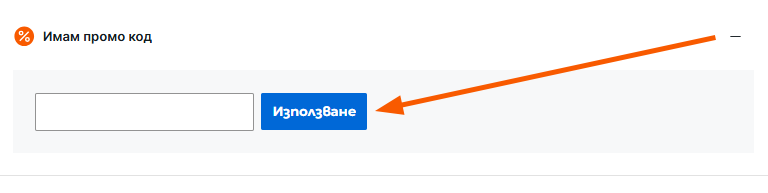 Кодът за купон за отстъпка може да се въведе в специално поле под списъка с избрани артикули в пазарската кошница. Натисни бутона Използване след като добавиш кода на купона и системата автоматично ще преизчисли общата стойност на поръчката с отстъпката - ще се появи съобщение, че купонът е успешно приложен.